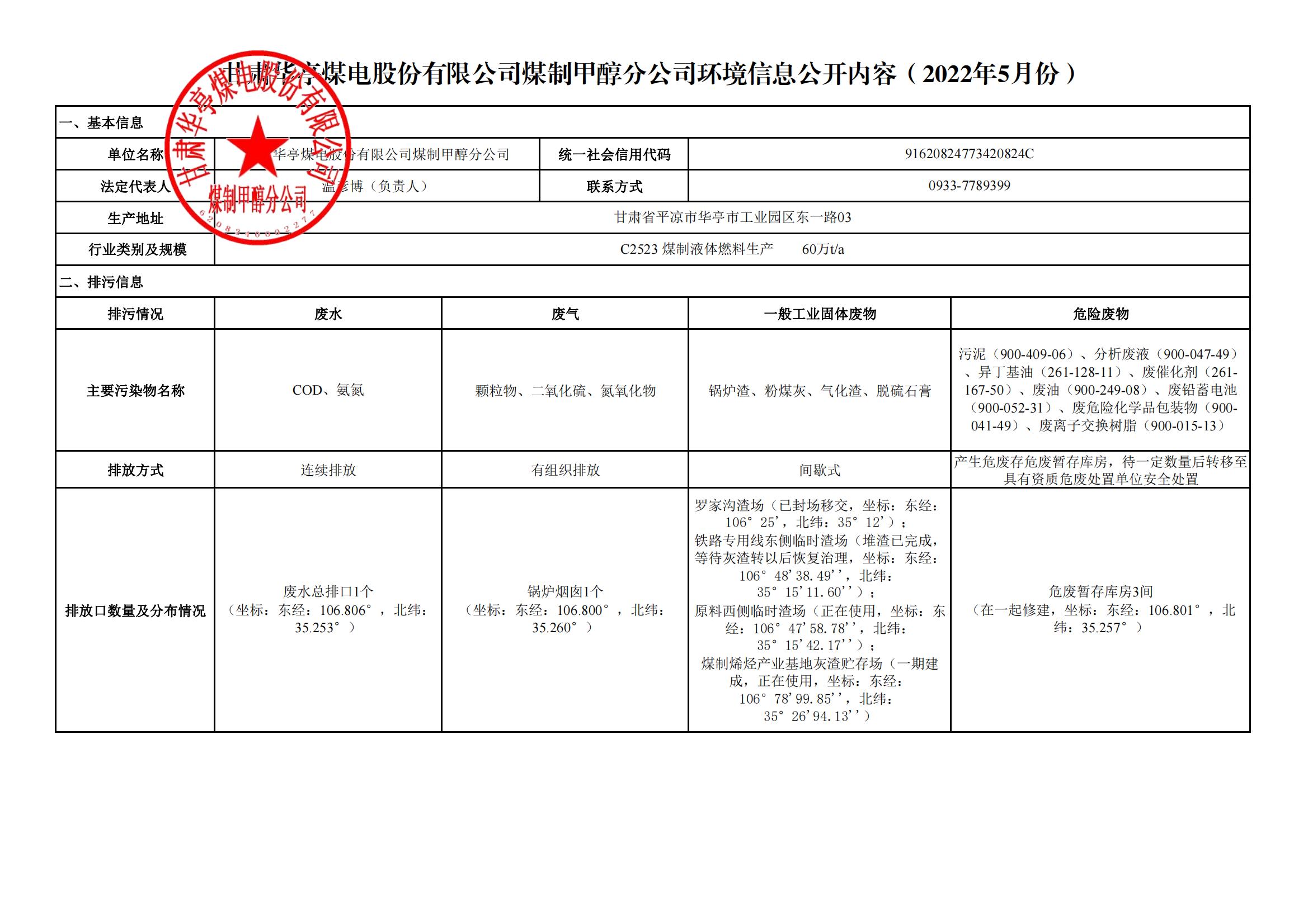 煤制甲醇分公司環(huán)境信息公開內容(2022年5月)