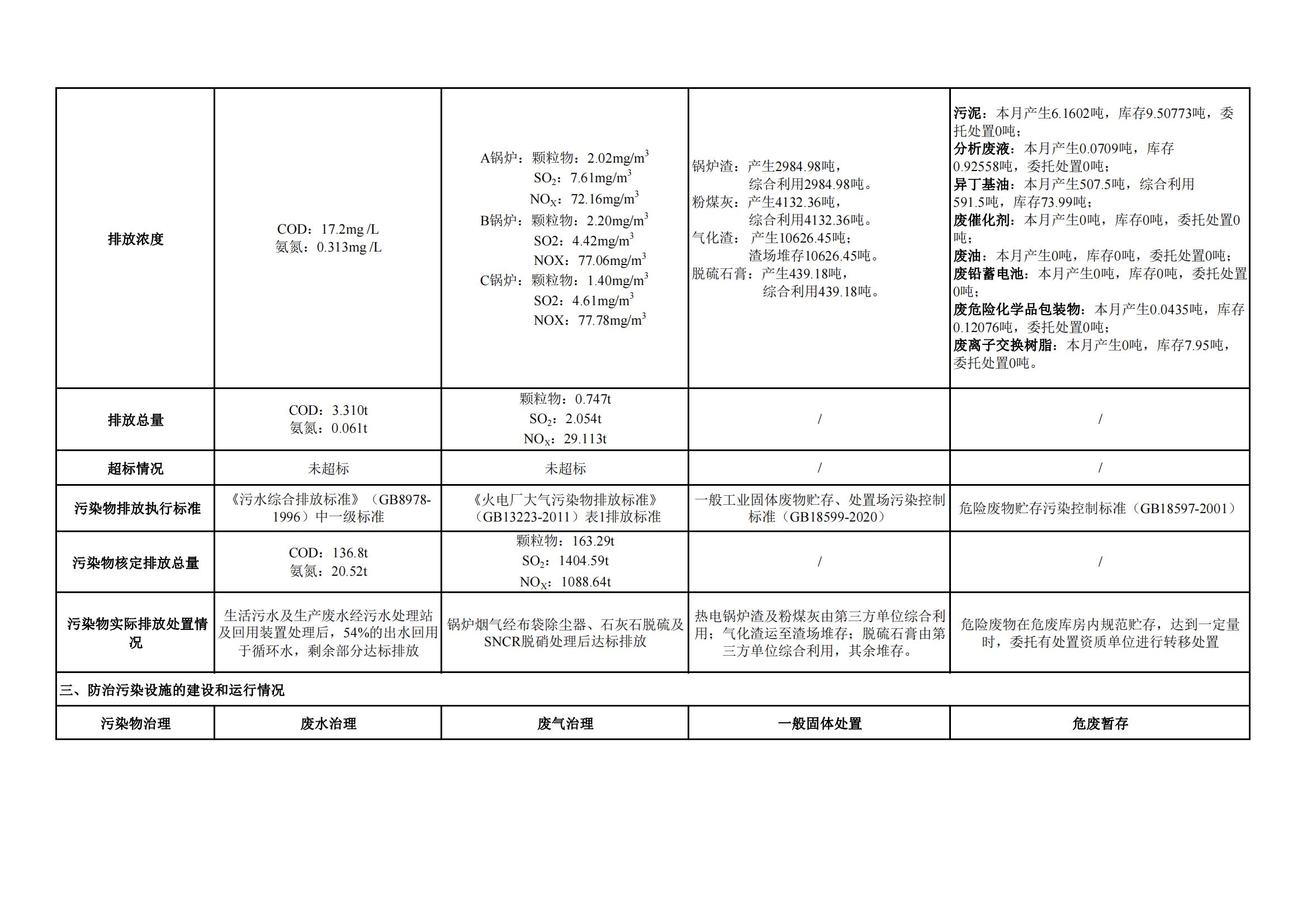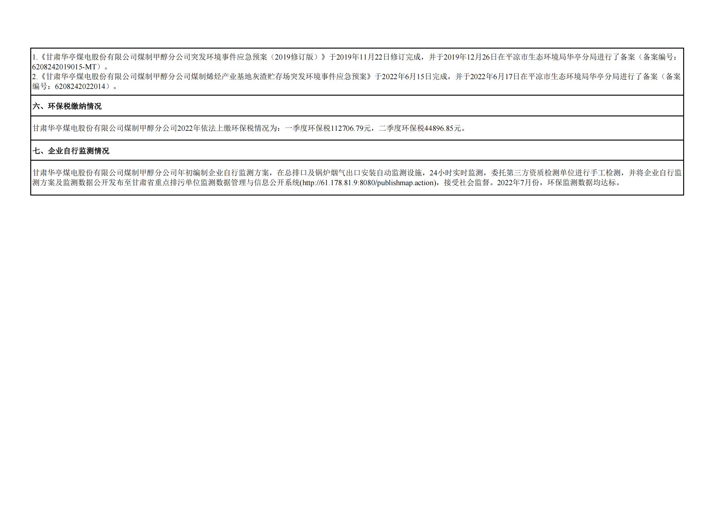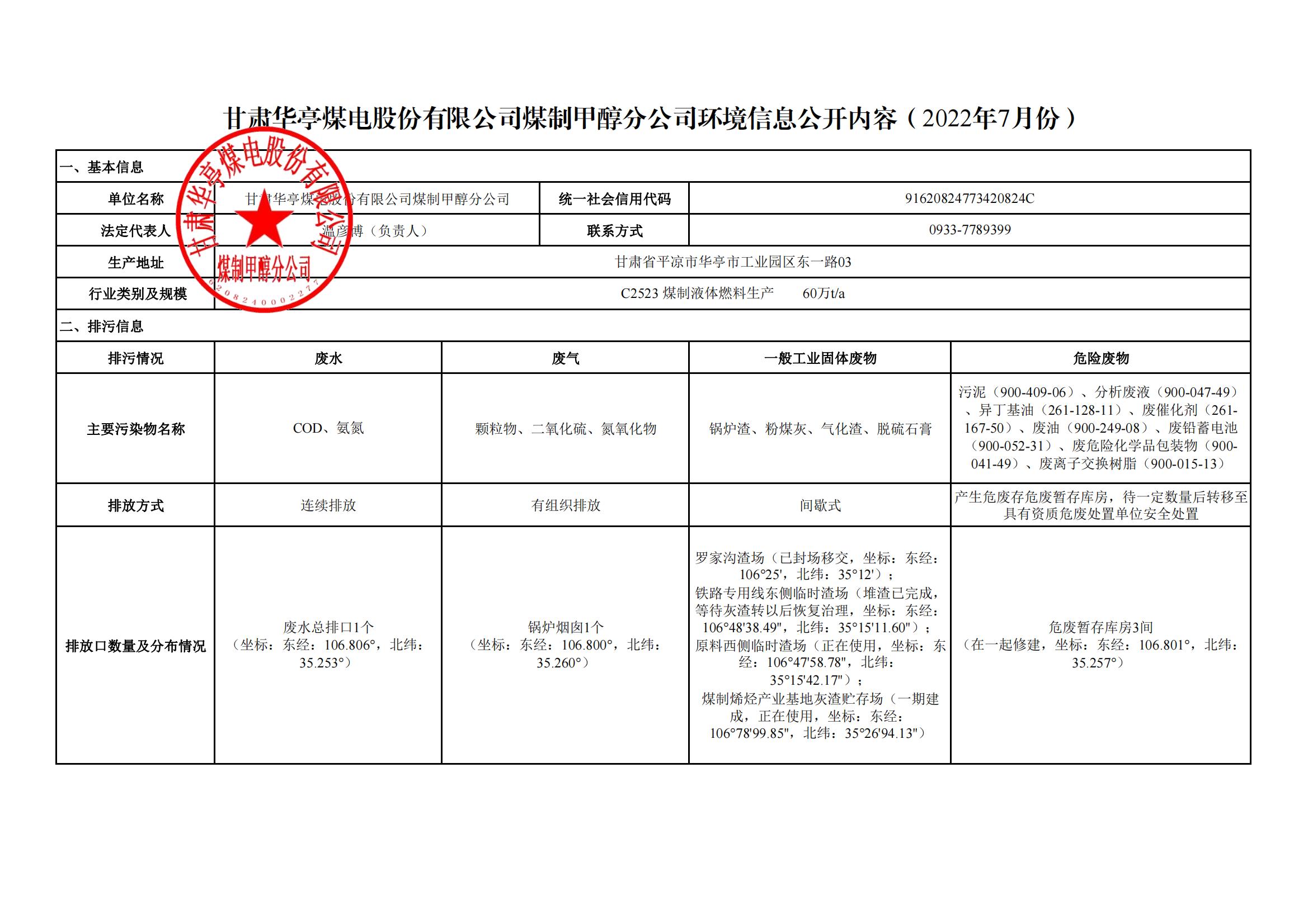 煤制甲醇分公司環(huán)境信息公開內(nèi)容(2022年7月)